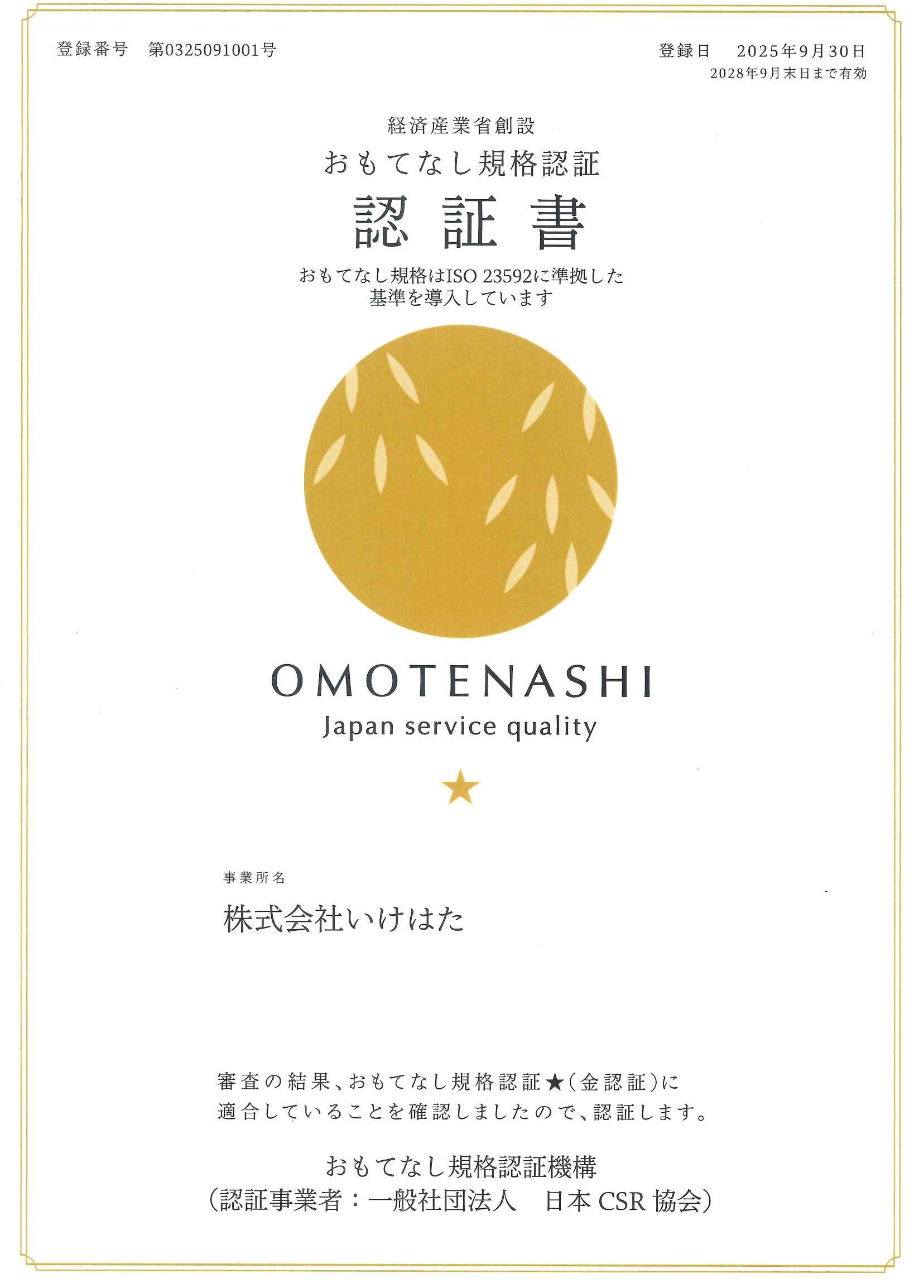 株式会社いけはたは「おもてなし規格認証」の審査を経て、2025年9月30日付けで再認証されました。