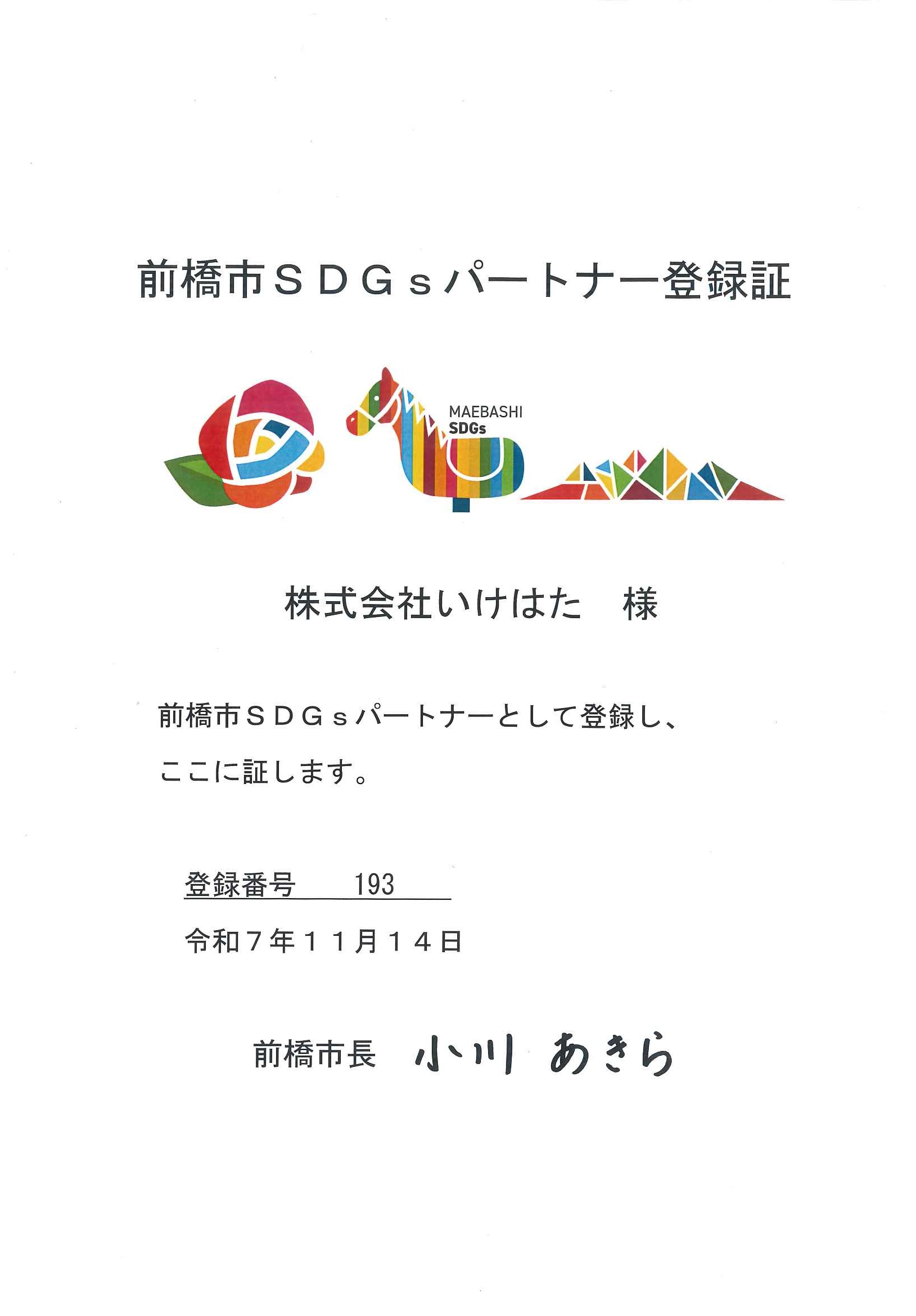 前橋市SDGsパートナー登録証